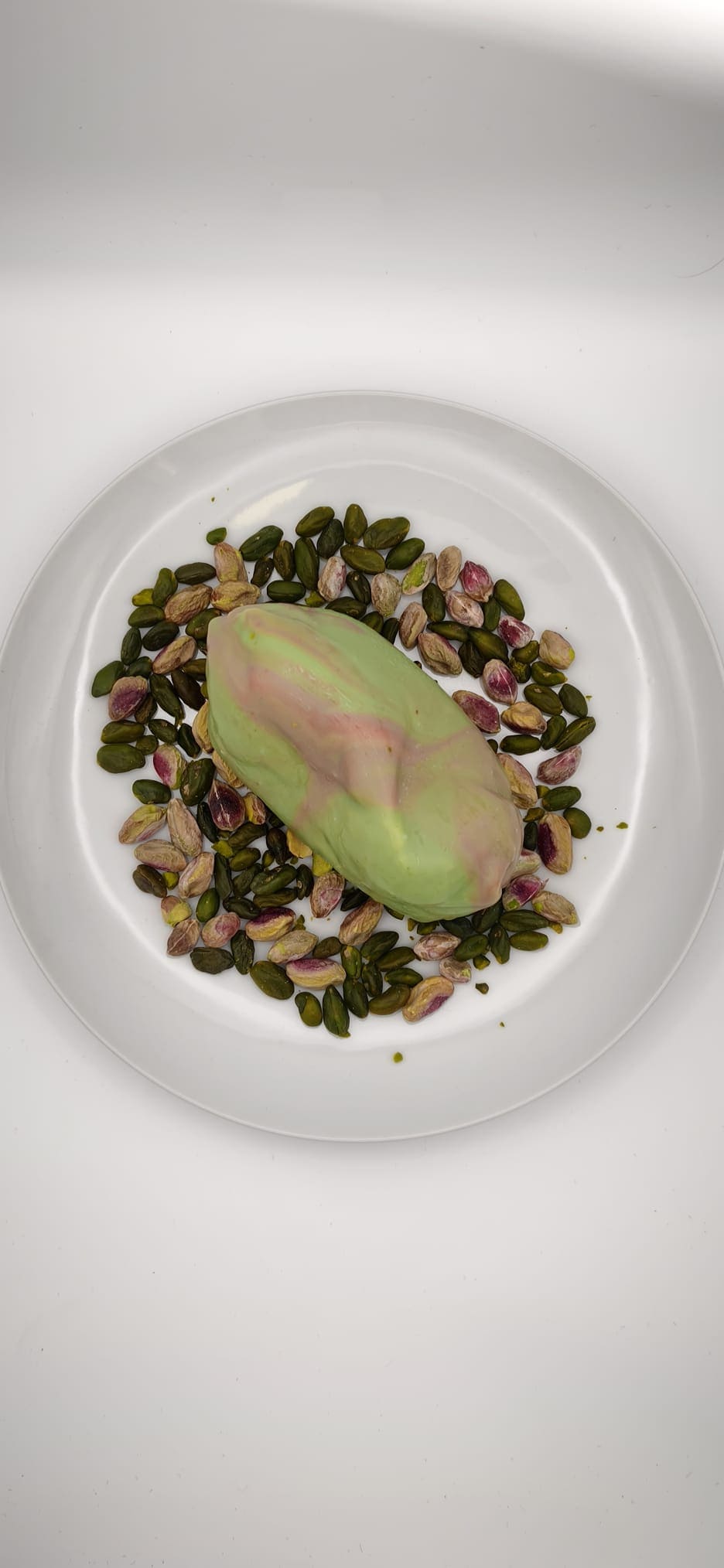 ortenfrucht aus Biscuitboden, Praliné-Croquant-Pistache, Ganache-Pistache, Cacao-Butter-Schale